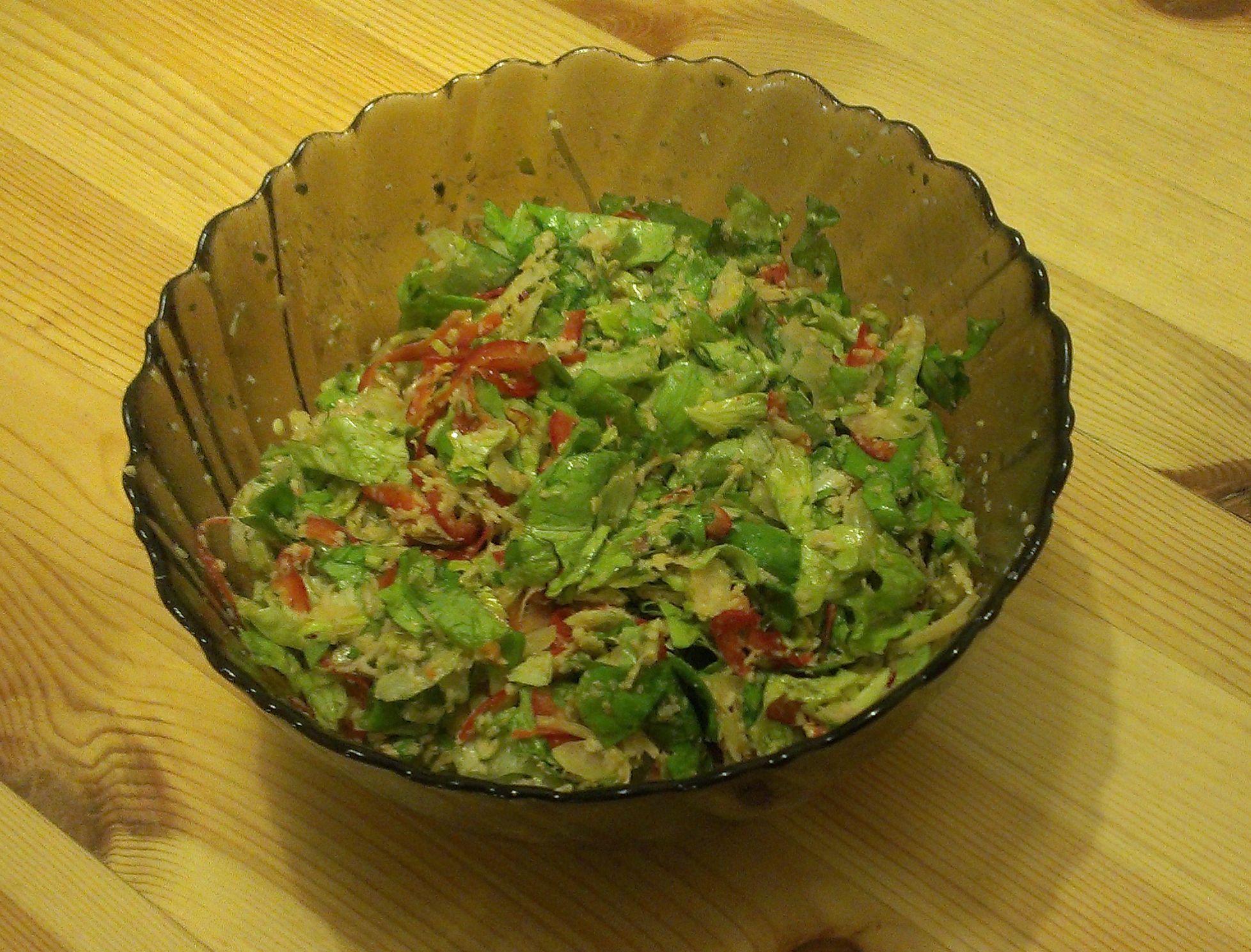 Hlavkový šalát nakrájame na drobno. Nastrúhame, alebo nakrájame na pásiky papriku a cibuľu. Na jemno nakrájame stonkový zeler. Pridáme pomletý sezam, nasypeme nori vločky, prilejeme olej a ocot, nasypeme čiernu soľ a pomešiame.